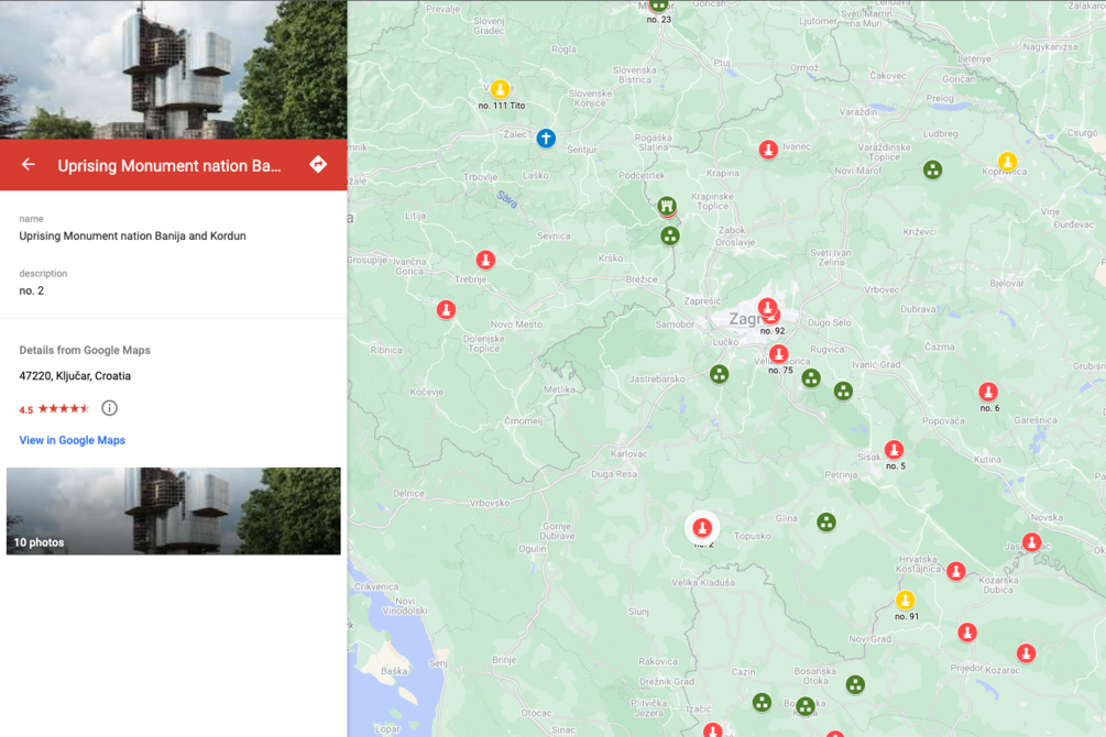 This is a PDF with a link to my Google My Maps of the Spomeniks. There are both a computer and a tablet/phone link.